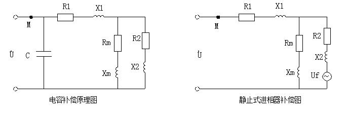 從圖可以看出,靜止式進相器和電容補償對電機的作用點不同,電容是在電機的前端定子側進行補償,其補償范圍是在補償點的前端;靜止式進相器串聯在電機的后端,其補償范圍擴大到了電機。